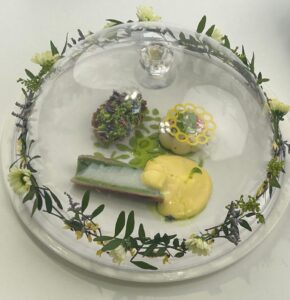 L’impiattamento ha previsto anche una splendida decorazione floreale della cloche, per richiamare l’attenzione dei giudici ed esaltare la composizione del piatto, in linea con i criteri di valutazione della competizione, annunciati dalla giuria.