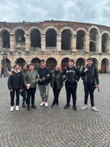 Il percorso è iniziato proprio dall’Anfiteatro Arena, uno dei più famosi e meglio conservati del mondo nonostante i suoi quasi 2000 anni di età! I nostri studenti si sono incamminati poi lungo Corso Mazzini, la via principale di Verona, fino a raggiungere un altro posto iconico, la Casa di Giulietta ed il suo famoso balcone degli innamorati, così come raccontati da Shakespeare. La giornata è proseguita attraversando Piazza delle Erbe, passando sotto le meravigliose Arche Scaligere, scorgendo la Casa di Romeo ed ammirando dal Lungadige il Teatro Romano e Castel San Pietro, adagiati sulla collina sulla riva opposta del fiume.  All’ultima tappa, Porta dei Leoni, si è concluso questo splendido giro della città, prima di fare rientro a Vicenza.